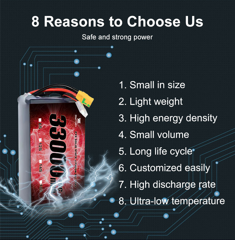 Технологія передової: твердотільні акумулятори з високою щільністю енергії та безпекою, включаючиЛегкий твердотільний літій акумулятор 32000mah 30000mah 5c10c легко налаштувати 2S3S45S6S БПЛА БАЛЬНІСТЬ.